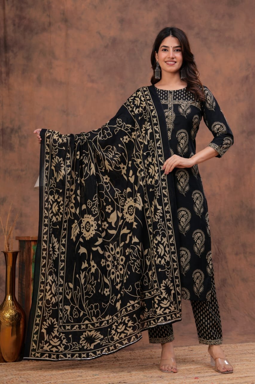 Elevate your ethnic wardrobe with our Dhanvi Hand Block Print Kurti Pant Dupatta Set, a masterpiece of tradition and comfort.