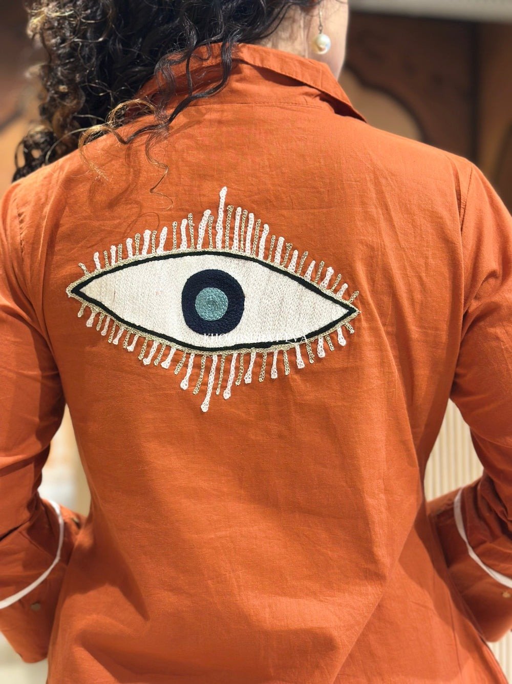 Evil eye embroidery detail for a unique twist