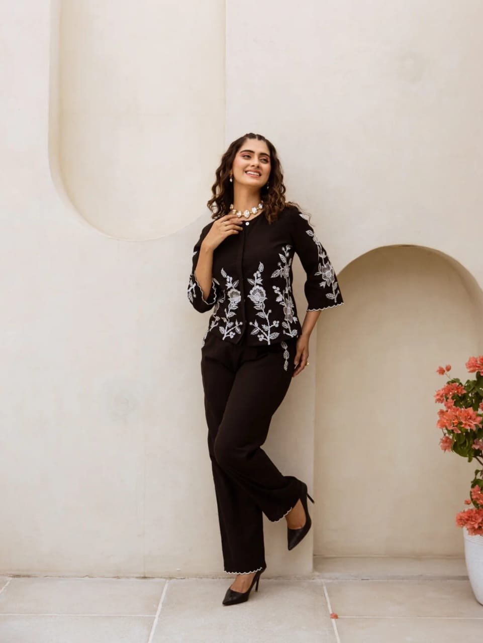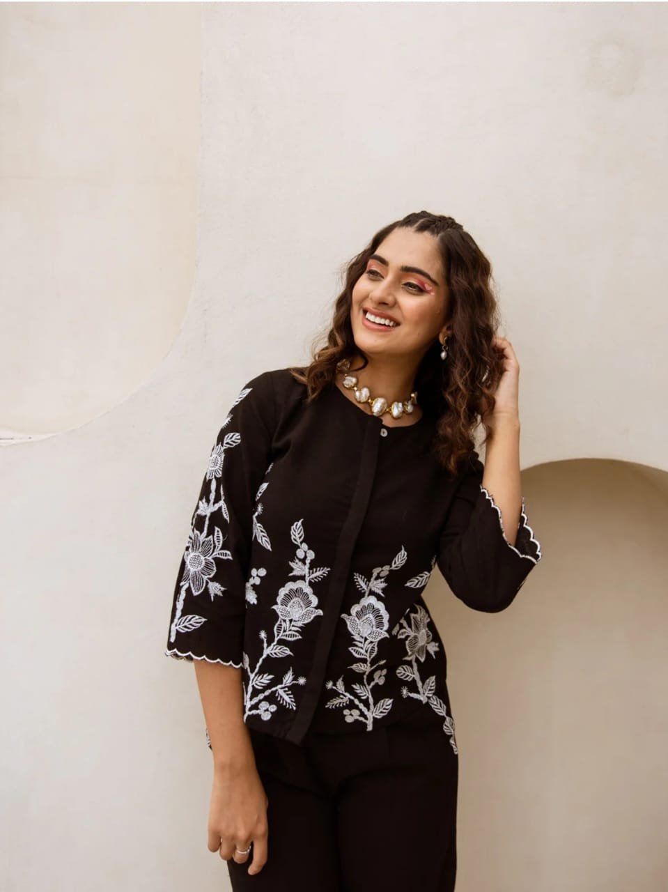 Look stylish and walk in comfort with our new embroidered co-ord set, designed to elevate your everyday wardrobe. This elegant outfit features a beautifully embroidered kurti paired with matching embroidered pants, giving you a chic and classy look. Crafted from pure cotton for all-day comfort, it also includes a convenient one-side pocket for added functionality.