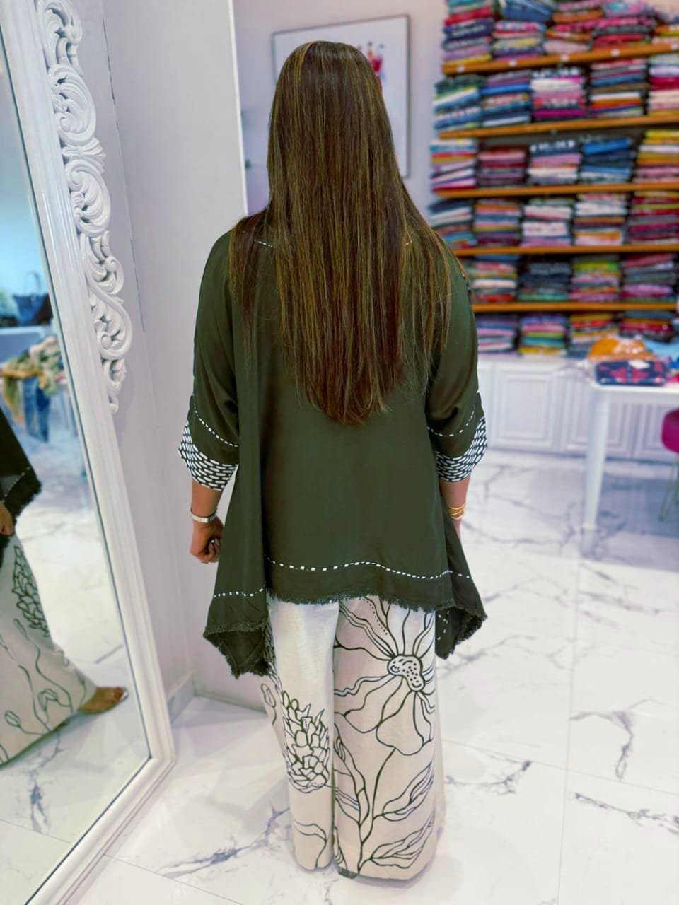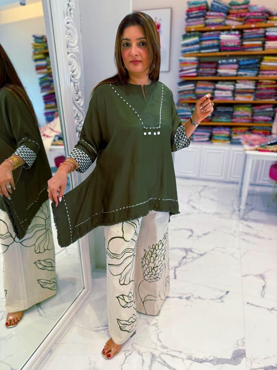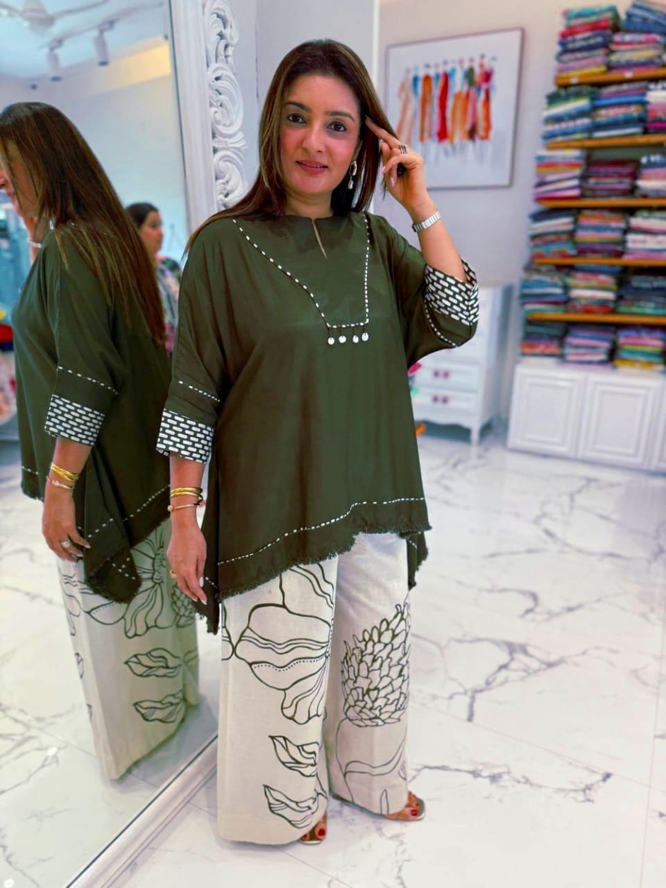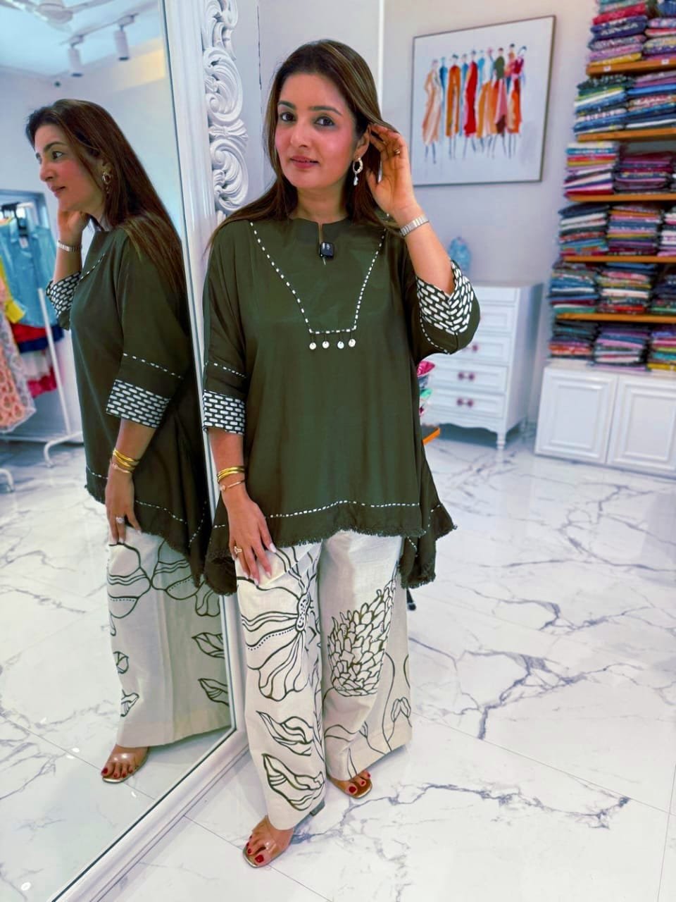 style with our Verdant Breeze Cord Set. Designed for comfort and effortless elegance, this premium cotton-reyon ensemble features a loose-fit kurta with minimal embroidery paired with breathable cotton palazzo pants. Perfect for workdays, casual outings, or vacation vibes, it keeps you cool while looking chic.